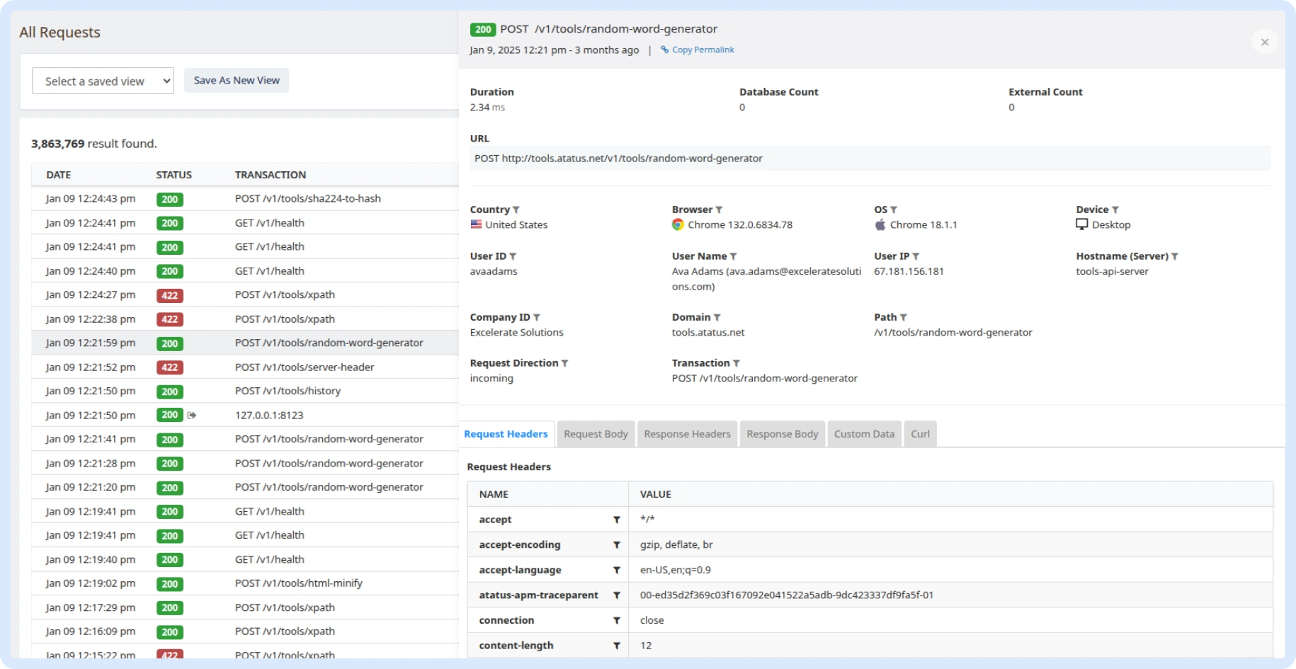 Trace requests, debug errors, and identify performance issues at the code level with clear context.