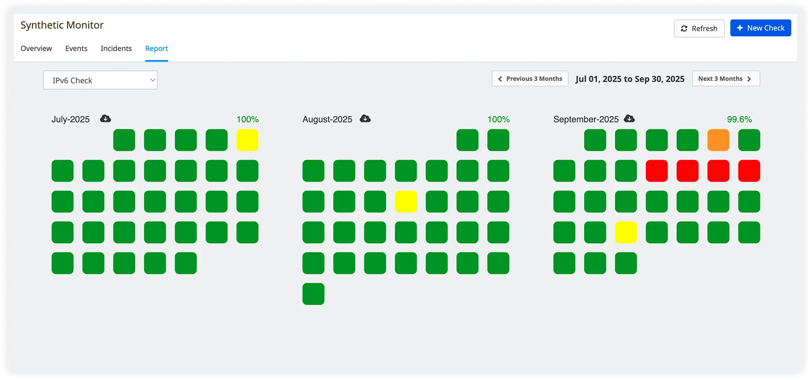 Track monitoring events, check results, incidents, and historical trends in one place to analyze reliability, share reports, and improve incident response over time.